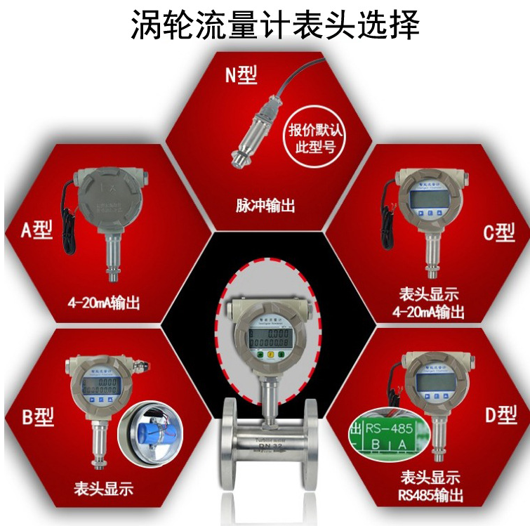 流體流經傳感器殼體,由于葉輪的葉片與流向有一定的角度,流體的沖力使葉片具有轉動力矩,克服摩擦力矩和流體阻力之後葉片旋轉,在力矩平衡後轉速穩定,在一定的條件下,轉速與流速成正比,由于葉片有導磁性,它處于信号檢測器(由永磁鋼和線圈組成)的磁場中,旋轉的葉片切割磁力線,周期性的改變着線圈的磁通量,從而使線圈兩端感應出電脈沖信号,此信号經過放大器的放大整形,形成有定幅度的連續的矩形脈沖波,可:遠傳至顯示儀表,顯示出流體的瞬時流量或總量。在一定的流量範圍内,脈沖頻率f與流經傳感器的流體的瞬時流量Q成正比,流量方程爲:
